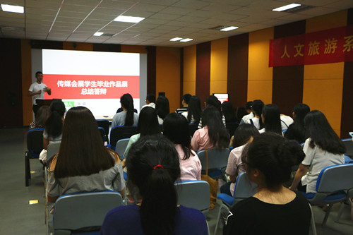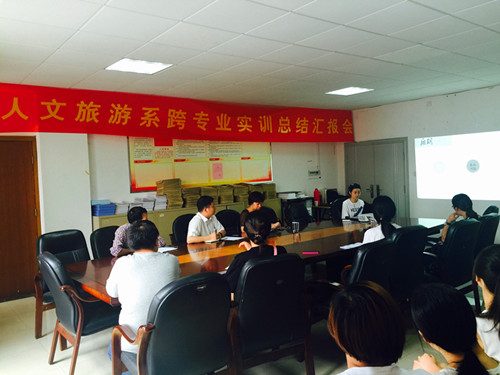 2015年6月10日,人文旅游系项目策划与创新创业跨专业综合实训总结报告会分别在系会议室418、3D实训室、9号楼401举行。系主任丁萍萍老师,系党总支书记吴刚群老师,系副主任谢芳老师以及各项目组指导老师应邀担任评委,本次跨专业实训的20个项目组组长及成员代表参加了汇报会。 各个项目的主讲人都对本组负责的项目的实施进行了总结汇报,回顾了项活动的策划案制定、前期宣传、活动组织和实施等,并对整个项目的策划以及具体实施的过程进行了梳理与反思。其中有不少人提到了团队成员间的协作至关重要,在项目开展中所得到的经验与收获也是异常珍贵。在各项目汇报完毕后,党总支书记吴刚群老师指出,本次总结汇报会的主要目的是要大家总结经验、发现不足,从而在以后的活动组织及项目实施过程中能有所提高并且避免类似意外的出现。他同时指出, “收获总是给努力付出的人”,每位参与其中的学员不管你在实训中承担什么任务,如果你参与其中并且认真对待,总会有所收获,这种经验的获得是课本上学不到的。 本次持续了近3个月,参与学生人数达360余名的系跨专业综合实训在各小组完成了总结汇报以后落下帷幕。来自不同专业、不同班级的学生,共同经历了集中授课,方案陈述、项目实施和总结汇报,在组员团结协作中共同完成了各个项目,同学们纷纷表示收获很大。