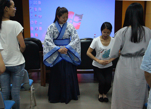 讲座现场,谢老师还教同学们正确穿戴汉服,示范了汉服礼仪中的坐容、立容、行容、拜容和揖礼等日常礼。